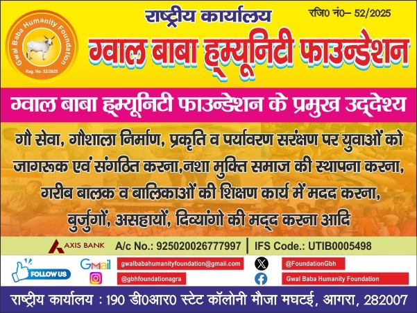 Gwal Baba Humanity Foundation एक पंजीकृत सामाजिक एवं आध्यात्मिक संस्था है, जो मानवता की सेवा, करुणा और समाज कल्याण के उद्देश्य से कार्य कर रही है।
